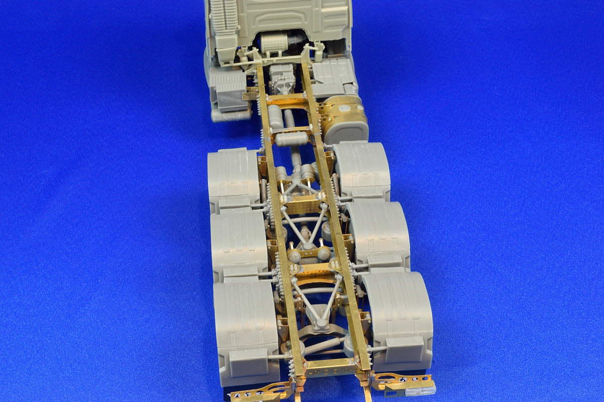 Highly detailed 8×4 air spring tridem chassis with lifting steering trailing axle for Swedish construction truck. Scale 1/24.