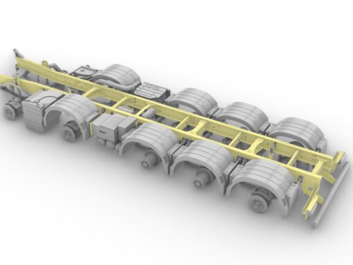 Highly detailed ultimate 10×4 air spring chassis with 2 front steering axle and lifting steering trailing axle. Scale 1/24.